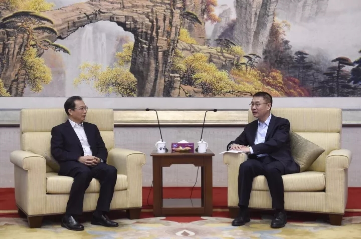 ▲江毅與南光集團(tuán)董事長傅建國會談。李志杰 攝