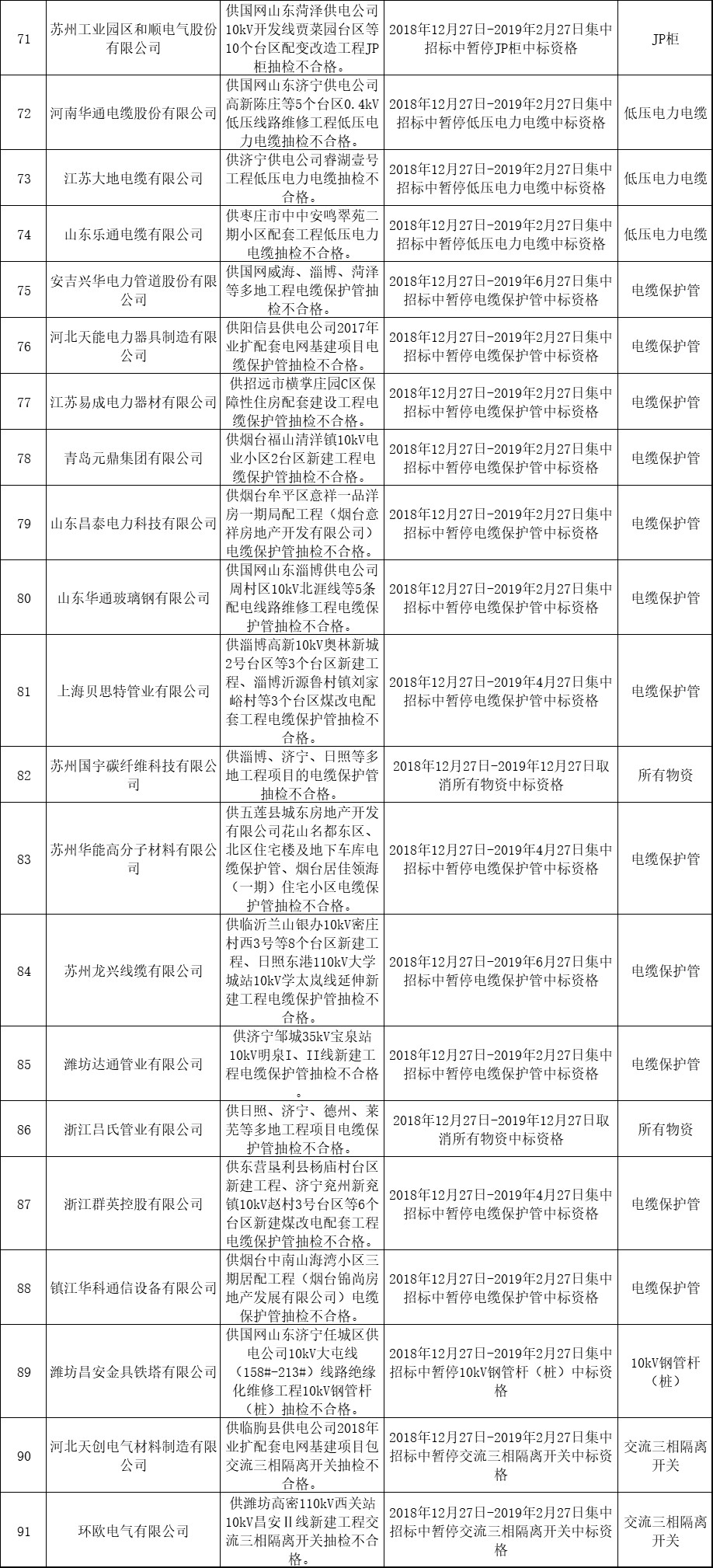 十九、國網(wǎng)山東省電力公司關(guān)于2018年第六批供應(yīng)商不良行為處理情況的公示(2018年12月)